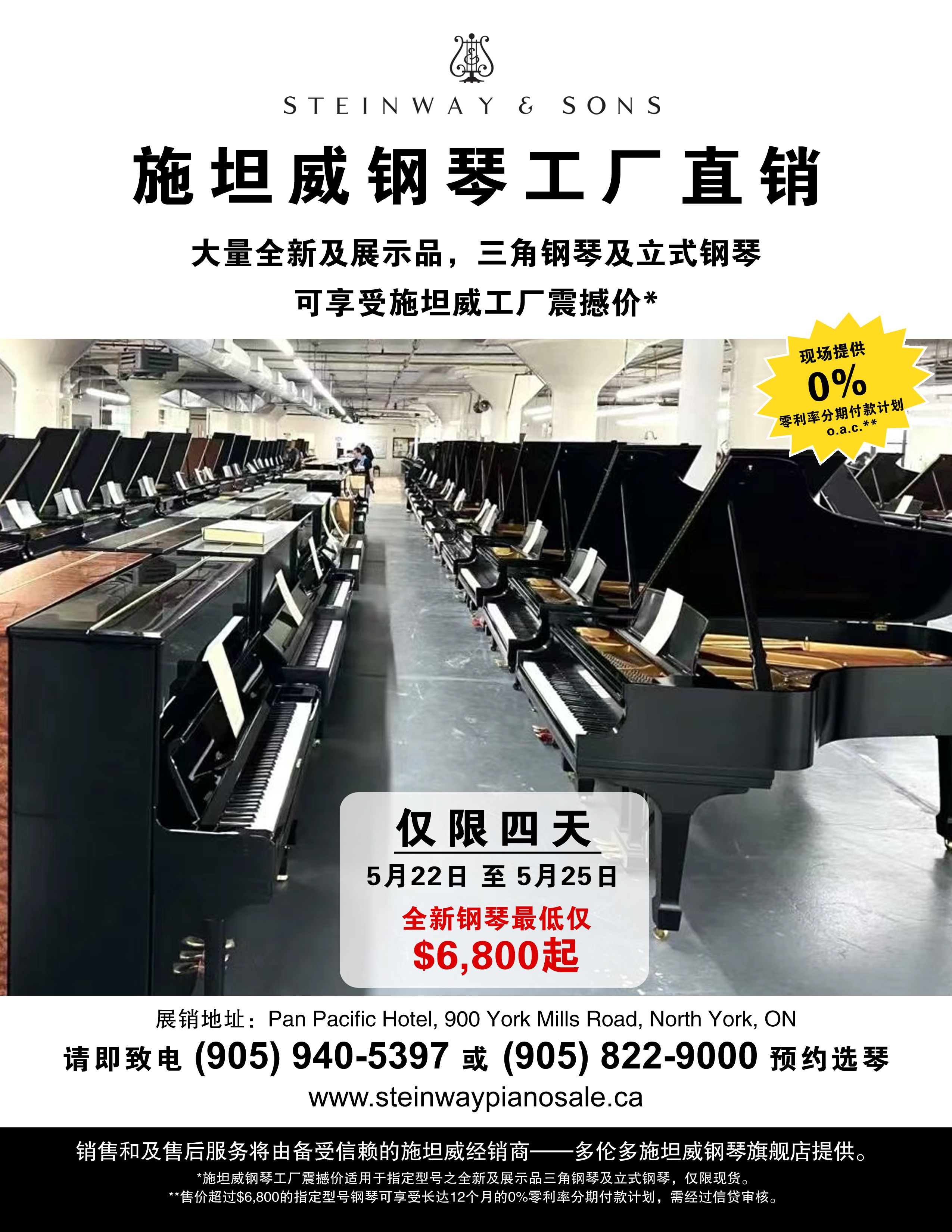 施坦威钢琴工厂直销活动将在大多倫多地区华举行,仅限四天,5月22日星期四至5月25日星期日,所有施坦威家族钢琴将会有前所未有的工厂直销震撼价优惠,这是一个大好机会将无与伦比的施坦威声音带到您的家中。