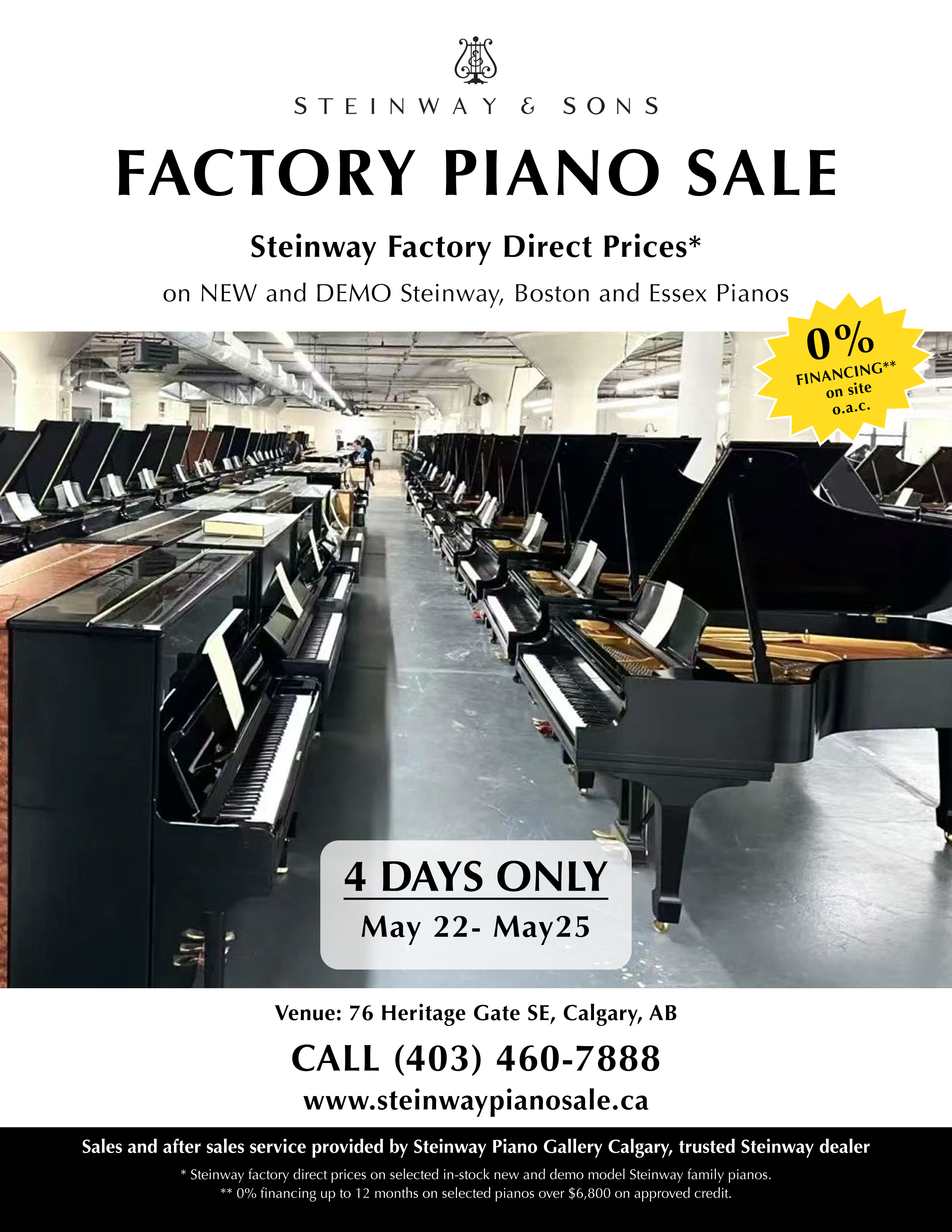 The Steinway Factory Selection Sale is coming to Calgary, Canada for one weekend only, Thursday May 22nd through Sunday May 25th. During these extraordinary times, Steinway has authorized unprecedented savings on all Steinway and Steinway-Designed Boston and Essex Pianos to bring the incomparable Steinway sound to your home.