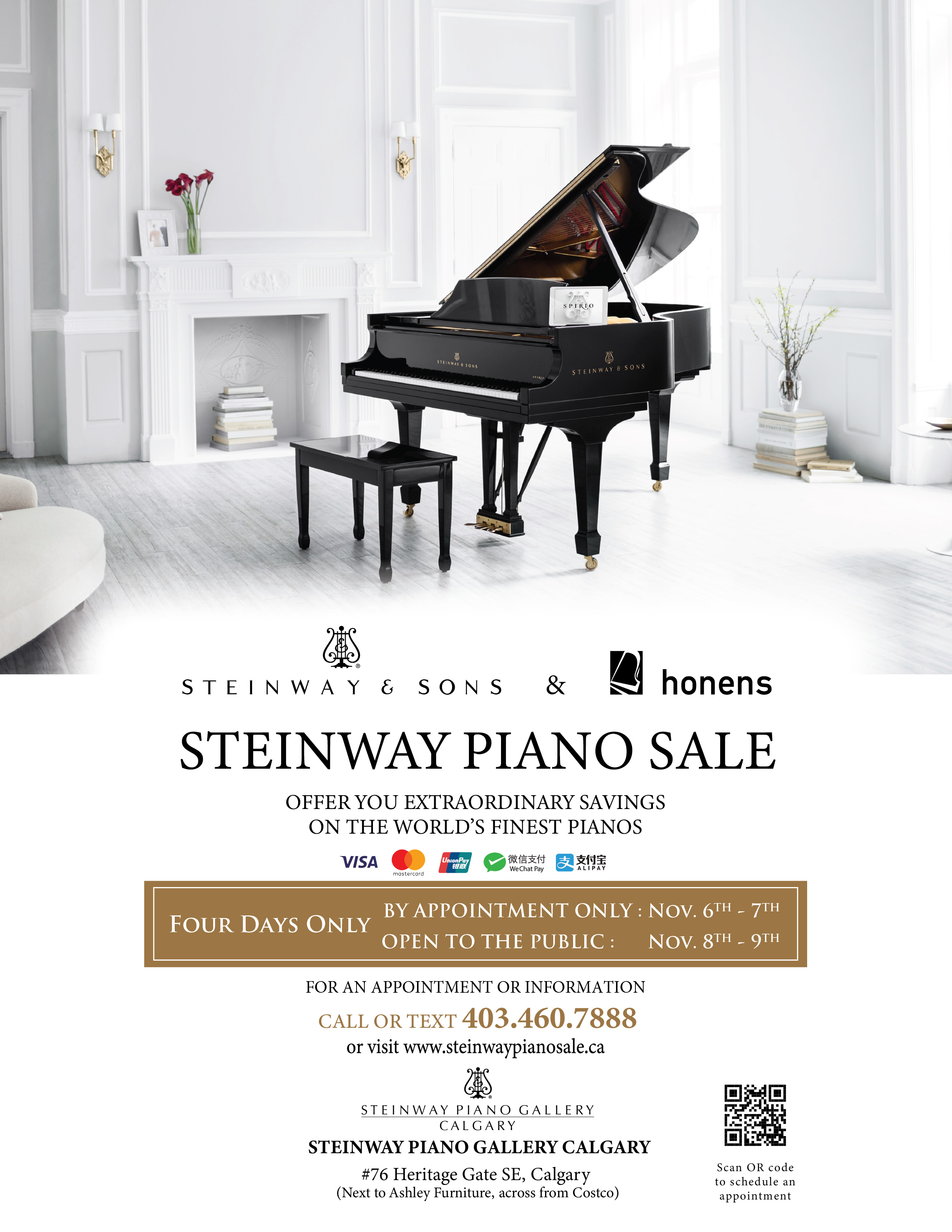 For more information or schedule your priority appointment, please call or text 403.460.7888 or visit www.steinwaypianosale.ca