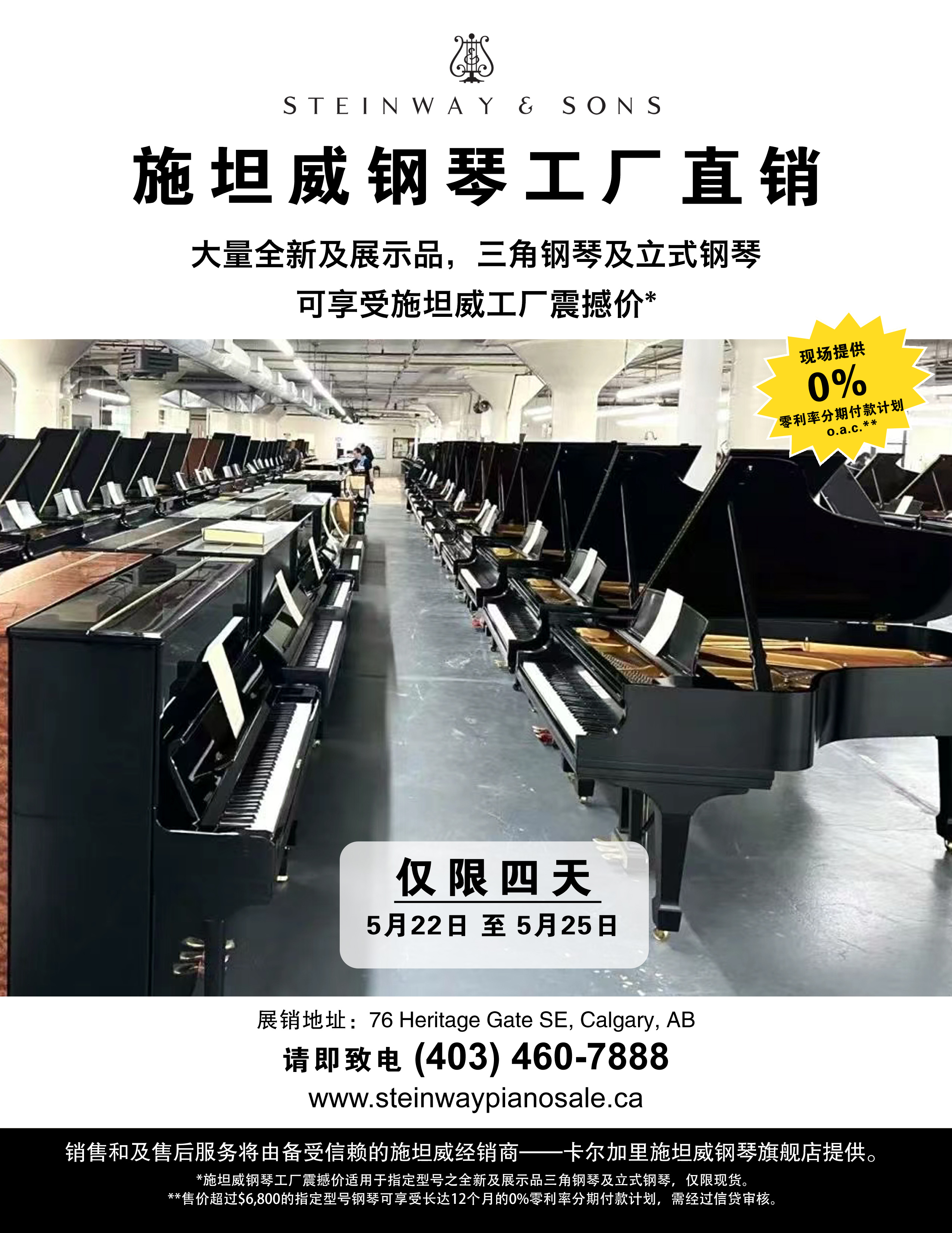 施坦威钢琴工厂直销活动将在卡尔加里地区华举行,仅限四天,5月22日星期四至5月25日星期日,所有施坦威家族钢琴将会有前所未有的工厂直销震撼价优惠,这是一个大好机会将无与伦比的施坦威声音带到您的家中。