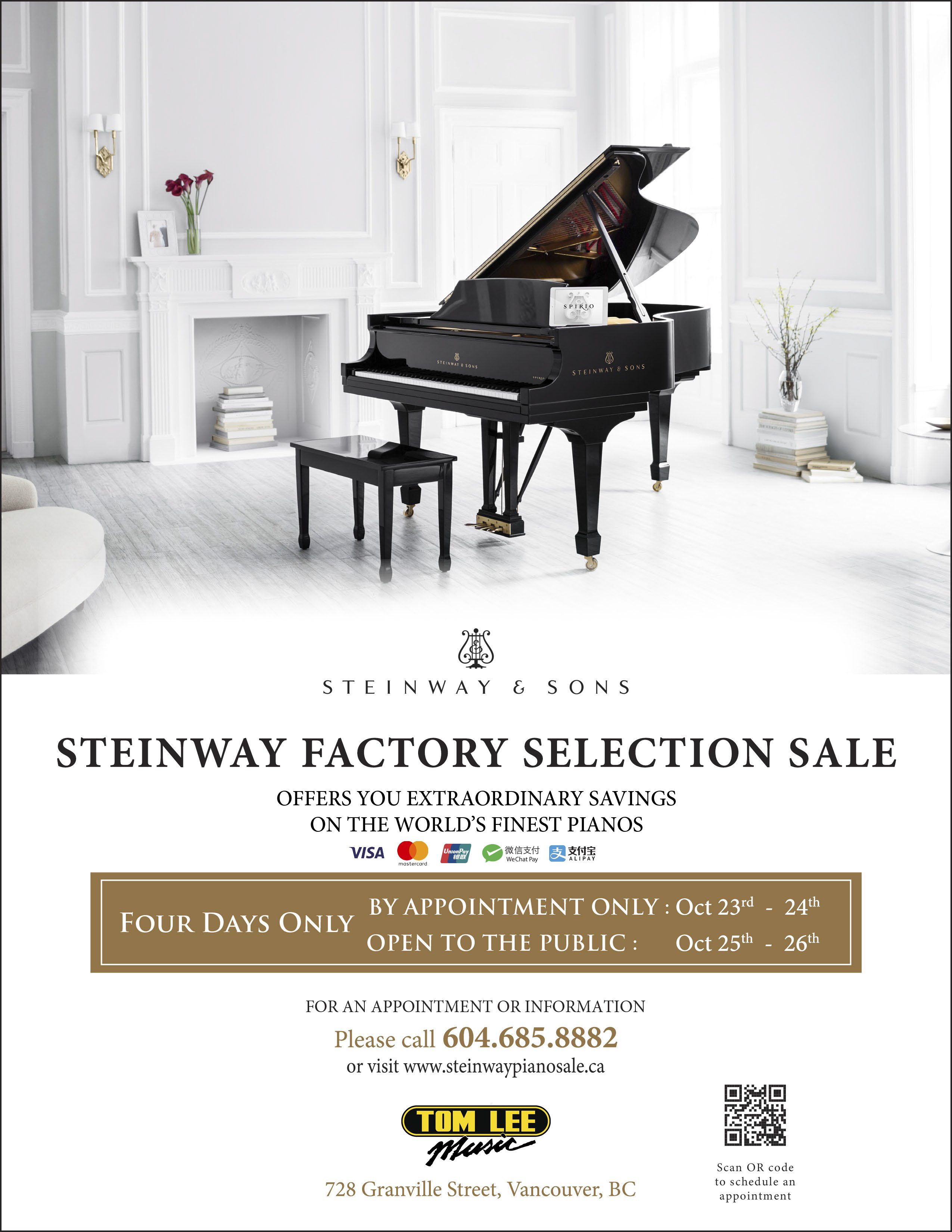The Steinway Factory Selection Sale is coming to Vancouver, Canada for one weekend only, Thursday Oct. 23rd through Sunday Oct. 26th. During these extraordinary times, Steinway has authorized unprecedented savings on all Steinway and Steinway-Designed Boston and Essex Pianos to bring the incomparable Steinway sound to your home.